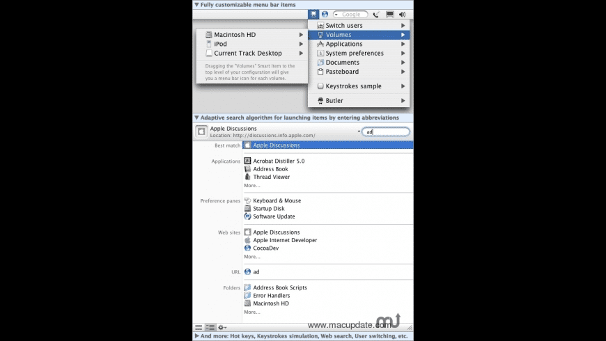 Butler for Mac lets you access items you have previously stored in your pasteboard, effectively turning your pasteboard into a stack. You can also take a snapshot of your current pasteboard and keep it for good. This feature is particularly useful for text snippets you need to enter on a regular basis. You can use the program to move and copy files, control iTunes, access the system preferences, change the current user, and so on. But the app really shines when it comes to customizing its behavior. Is your menu bar too crowded? Use the tool's docklet. Do you want a menu for each mounted volume? Do you want a menu to pop up when you press a certain hot key? Do you want all running applications in your menu bar? Or do you prefer doing things with your keyboard only? Whatever kind of interface you prefer, the app is at your service.